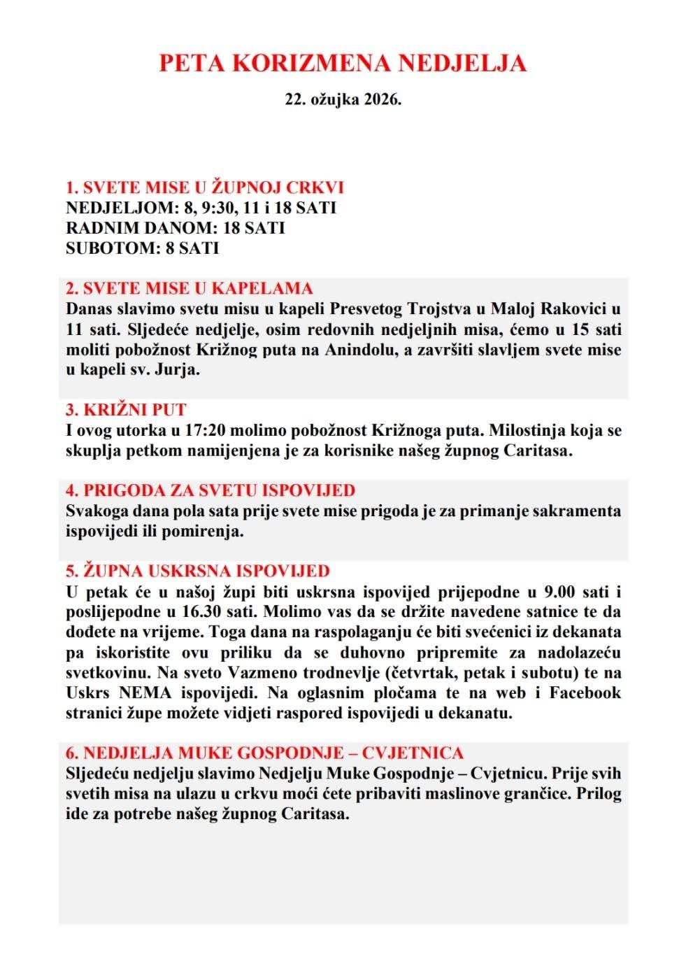 ČETVRTA KORIZMENA NEDJELJA, 15. ožujka 2026.