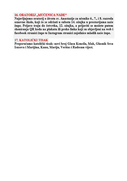 DRUGA KORIZMENA NEDJELJA, 01. ožujka 2026.