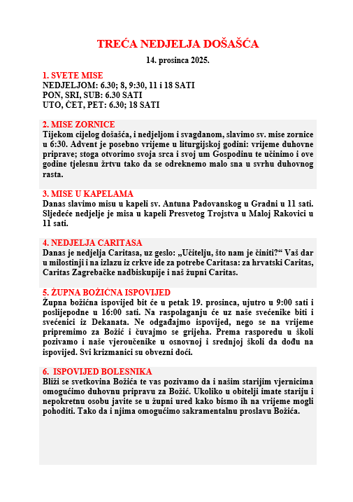 TREĆA NEDJELJA DOŠAŠĆA, 14. prosinca 2025.